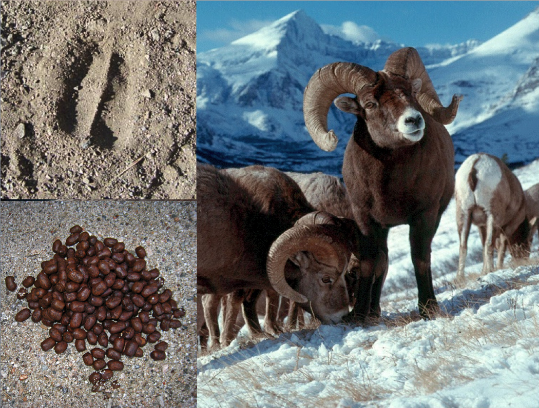 Since I didn’t have a good bighorn sheep picture of my own, and there weren’t any cheap (or free) at the stock photo house, I picked one up from Wikipedia, overlaid some scat and track photos, and it made a perfect slide.