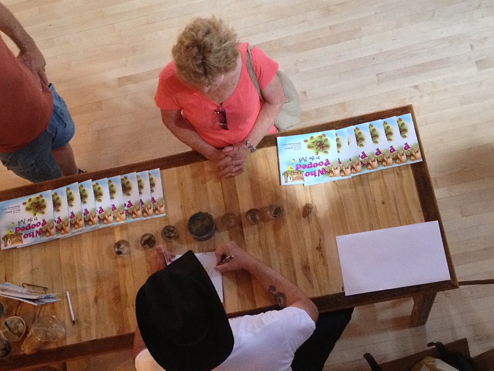 Every writer should have the experience of being recognized. It’s an amazing feeling. When I was having breakfast with my wife the following morning, someone came up with a book she’d purchased in the gift shop right before the evacuation and hadn’t gotten signed. She recognized me, of course, by my ruggedly handsome face and thoughtful, intelligent demeanor. It had nothing whatsoever to do with the Who Pooped in the Park t-shirt I was wearing.
