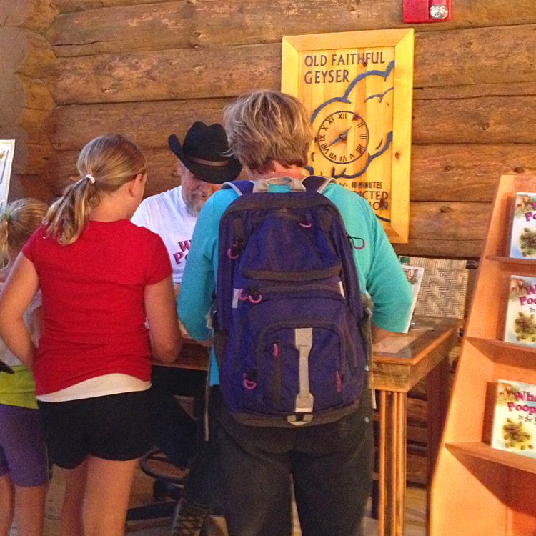 It’s Sunday, July 6, 2014. I’m at Old Faithful Inn signing copies of the Yellowstone edition of Who Pooped in the Park? People show up in spurts here. When the Old Faithful geyser is about to erupt, the lobby is almost empty. Right after the eruption, it teems with people. The cell service here is spotty at best (doesn’t work for me at all), so I’m jotting down thoughts in my notebook when I’m not busy. Here’s a sampling of them.