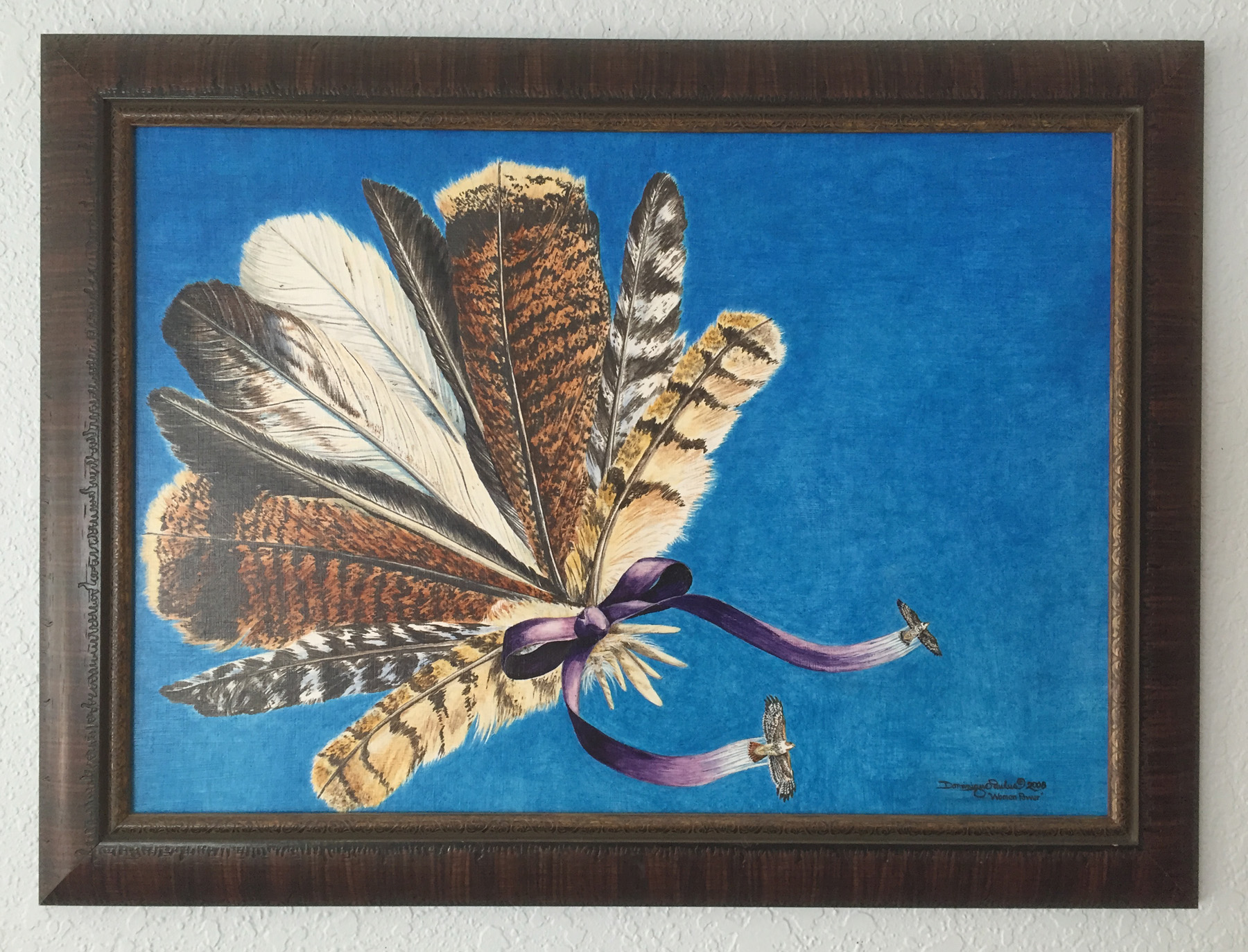 Dominique Paulus is an artist who paints, among other things, birds. We have one of her original paintings hanging on our living room wall (“Woman Power,” seen at right). She’s been my friend for years, and we’ve chatted quite a bit about birds when she’s in my bookstore shopping for bird books.