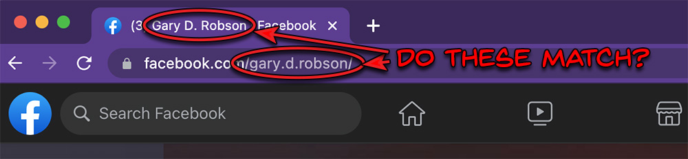 - The name and username don’t match (see picture below). This can also happen when you have friends without much computer and/or Facebook experience that don’t know to set their username.