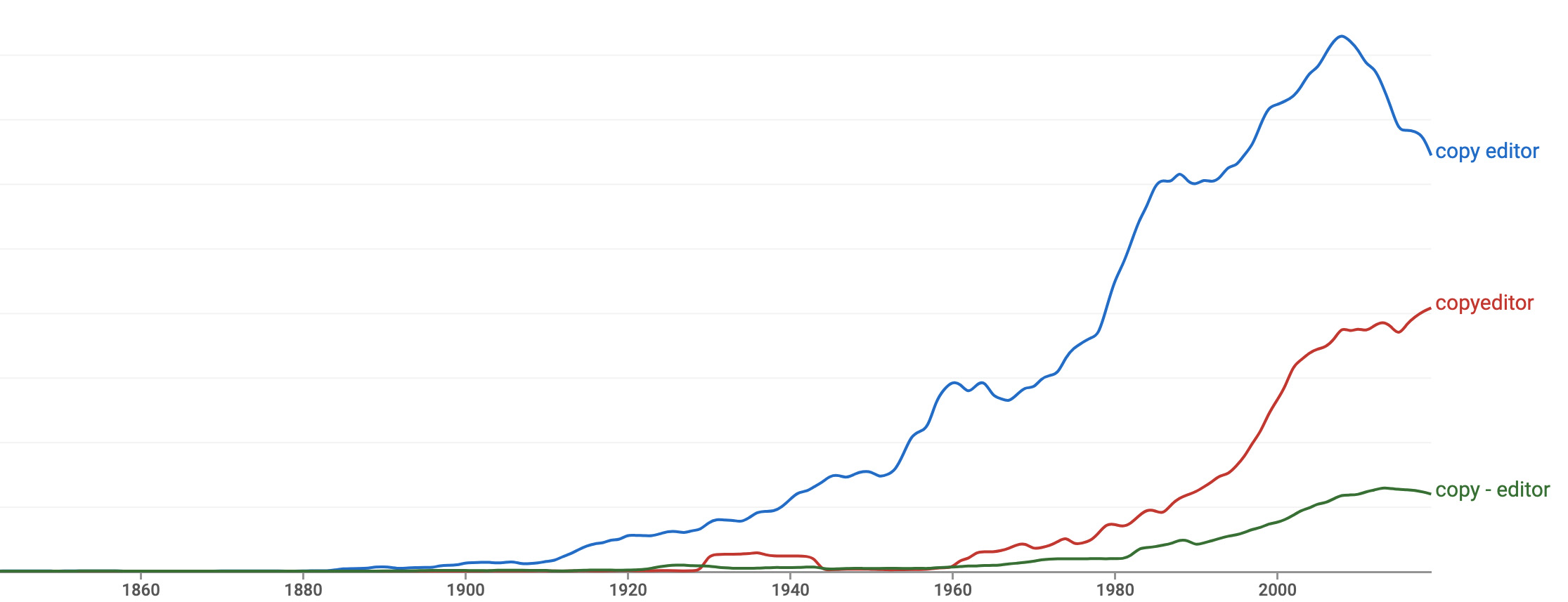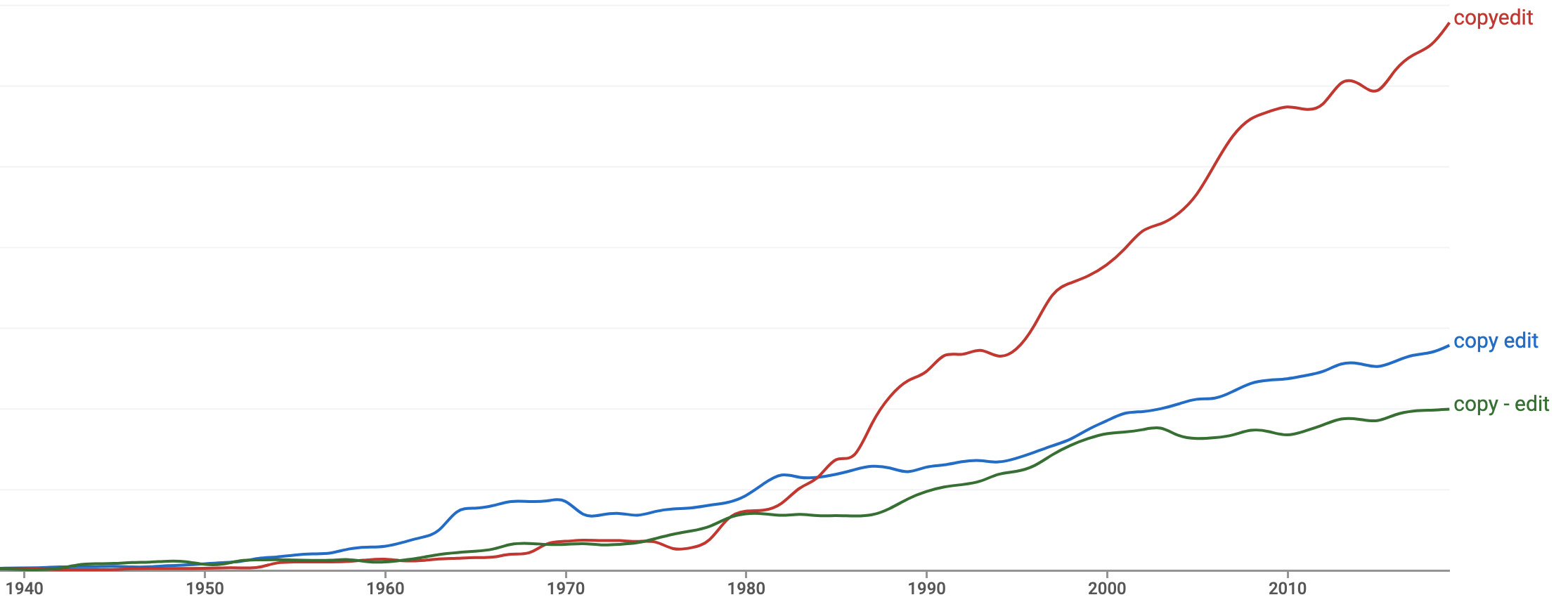 Using n-grams, it became quite clear that the one-word version of copyedit became the most popular in the early 80’s, and copyeditor wasn’t far behind.