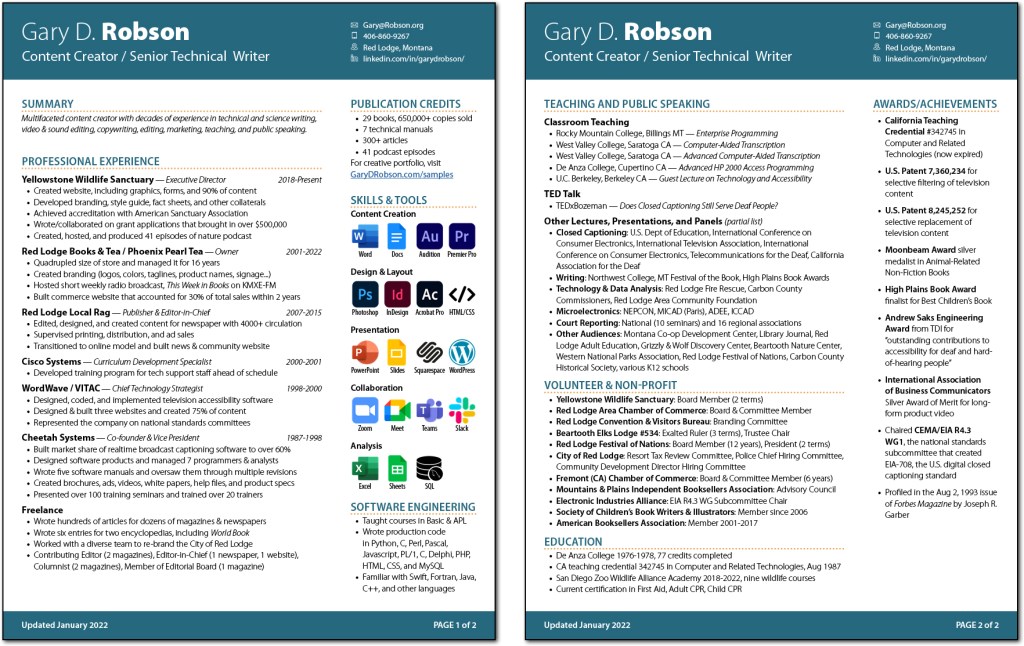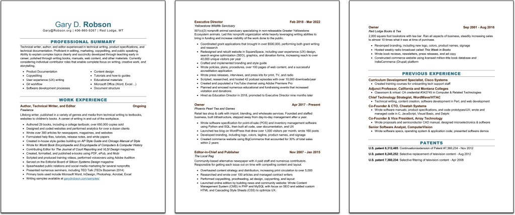 My resume is decidedly non-standard. In the 45 years since I left college, I’ve changed careers several times, working as a software developer, integrated circuit designer, teacher, curriculum designer, author, engineering manager, nonprofit executive director, chief technology strategist, marketing & branding specialist, and more. A great deal of my experience is freelance, which ATS packages don’t seem to understand. And worst of all, I don’t have a college degree.