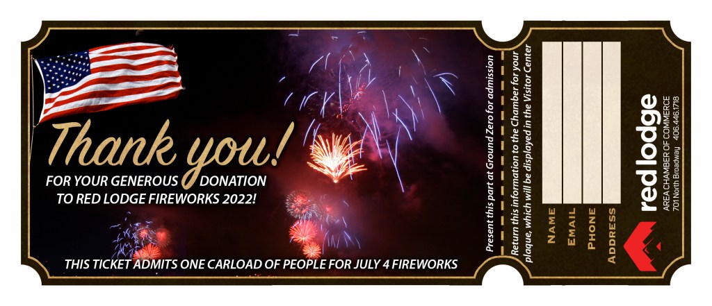 Each year, Red Lodge Proud & Beautiful and the Red Lodge Area Chamber of Commerce put on a fireworks display. To raise funds for the fireworks, they offer “Ground Zero” tickets to large donors to watch the fireworks display from very close-up. My wife and I volunteer each year to staff the gates and guide visitors.