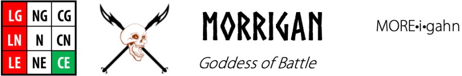Morrigan follows no rules and cares nothing for the needs or cares of others. She respects skilled warriors who follow her example, and will protect her followers—most of the time. She doesn’t understand Lawfully-aligned people and doesn’t want them as followers.