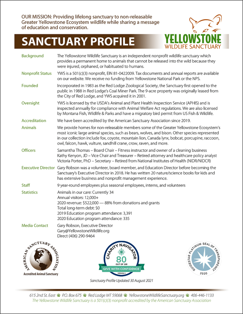 I created a full style guide for Yellowstone Wildlife Sanctuary, and then made this single-page summary for reporters and consultants.