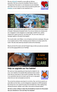 The email newsletter uses colorful pictures featuring people and cute animals. It has clear calls to action (the two light-blue buttons) and it shows the public what the organization is doing with donations.